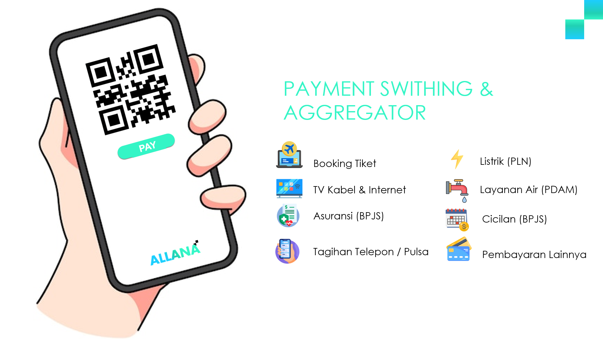 Menyediakan berbagai biller (multi biller) seperti listrik (PLN), mobile prepaid dan paypaid, ticketing, voucher, dll,selain untuk menangani layanan pembayaran online.